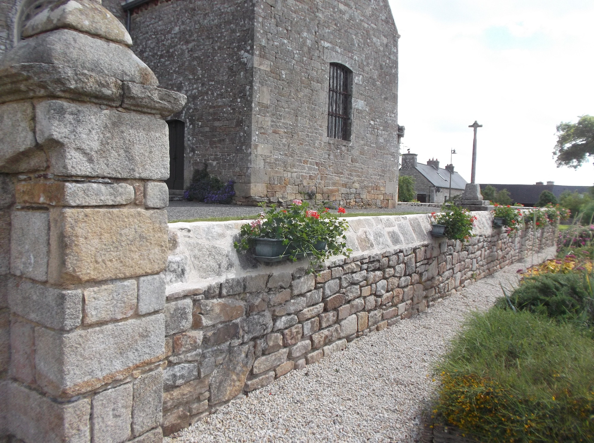 Réfection des joints du couronnement du mur d'enceinte de l'église à Mégrit
