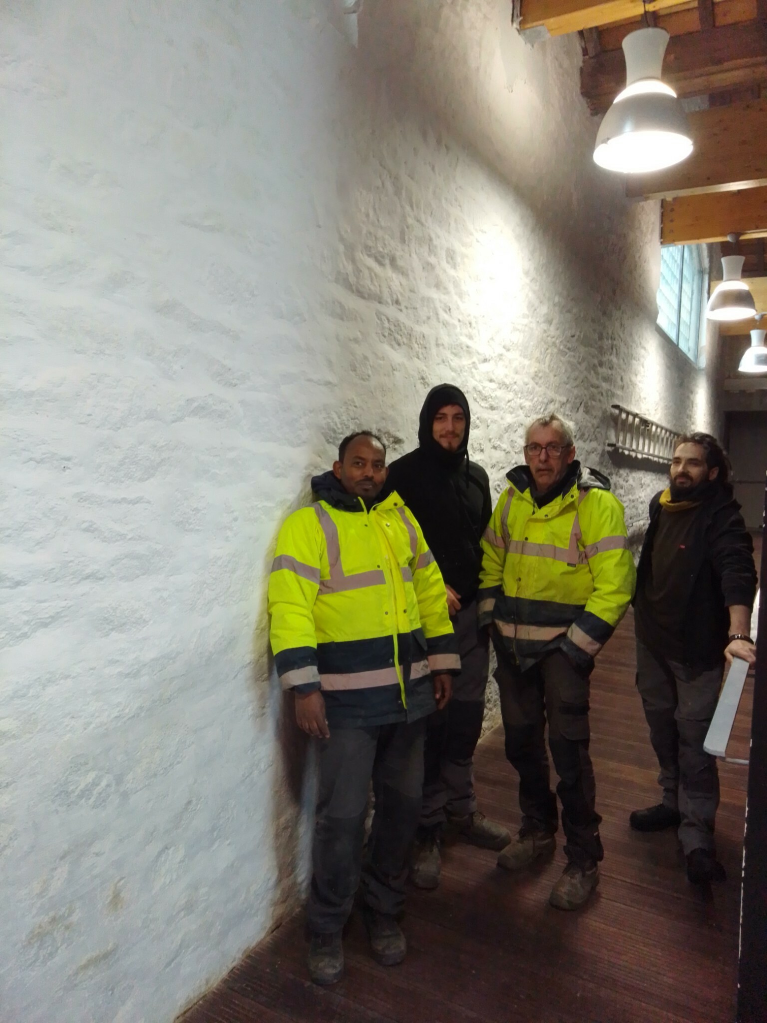 Un mur intérieur du Labo de Dinan a été entièrement refait à l'enduit puis peint à la chaux par notre équipe.